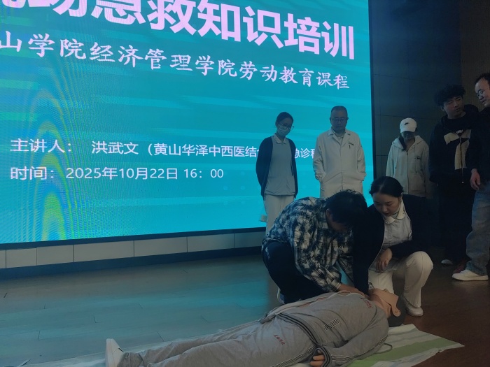 为进一步提升青年学生应急救护能力,强化劳动教育课程实践内涵,10月22日下午,6776永利集团特邀黄山华泽中西医结合医院急诊科主任洪武文及医护团队来校开展以“海姆立克急救、心肺复苏、现场急救包扎”为核心内容的急救知识培训。本次活动作为学院劳动教育课程的重要实践环节,24级全体学生参加培训,现场学习氛围浓厚,互动性强。