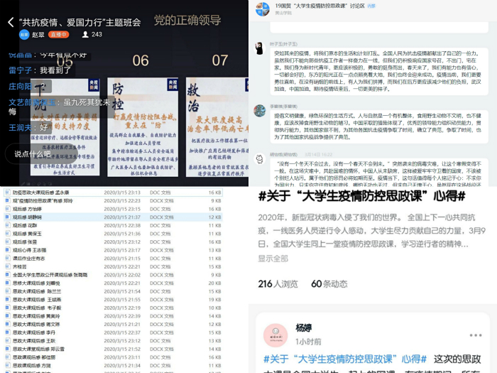 为贯彻落实《教育部社科司关于组织“全国大学生同上一堂疫情防控思政课”的通知》要求,在举国上下万众一心、众志成城做好新冠肺炎疫情防控工作的特殊时刻,引导广大师生增强“四个意识”、坚定“四个自信”、做到“两个维护”, 3月9日至16日,学院积极组织师生观摩“思政大课”,课后开展在线讨论,撰写学习心得,圆满完成了收看任务。