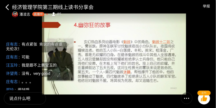 主讲嘉宾通过PPT展演和视频播放分享读书心得。陈龙龙同学分享的《万历十五年》,通过历史学家黄仁宇对这段历史的讲释,认同表面上看似末端小节的小事,实质却是以前发生大事的症结,预示掀起波澜的时代机缘,其间的关系因果,以“大历史观”生动再现。黄保玉同学分享的动漫《魁拔》,将青青树团队制作的系列动漫精彩展现,通过人物性格分析,引申做人哲理,分析国漫发展阻碍与前景。学生根据自己的领悟,以申请连麦方式对主讲人的分享内容发表了自己独到的观点。两位老师分别作内容点评,王佩玲肯定同学的精彩表现,认为青年学生是有为的一代,勉励大家科学管理时间,养成良好的阅读习惯和独立的思考能力。吴边认为时间是催化剂,希望同学们坚持阅读,合理规划时间,就阅读方式提出了合理化建议。