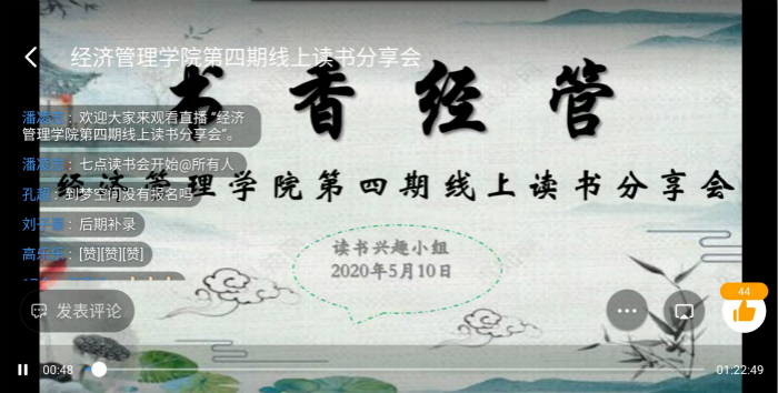 据悉,此次线上读书分享会是该院培育和践行经管人精神系列活动之一,也是该院打造书香经管品牌活动之一,旨在引领学生品经典、读好文、悟人生。