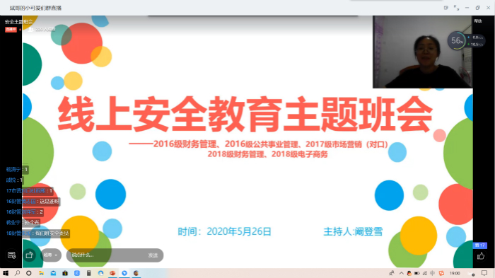 5月26日晚,6776永利集团16级财务管理、16级公共事业管理、17级市场营销对口、18级财务管理以及18级电子商务五个班通过钉钉顺利召开安全主题班会,会议由18财管安全委员阚登雪主持。