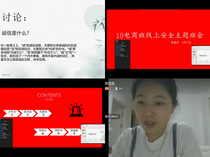 组织委员赵业格结合关于曾子讲诚信的小故事,深入浅出的讲解了诚信对一个人来讲的重要性,强调大学生一定要讲究诚信,要自尊自爱,懂得感恩;随后,安全委员牛帅龙就户外安全、防震减灾、拒绝网贷、网络诈骗预防、禁毒教育等关乎学生健康成长的问题,进行了深入细致的讲解,提醒大家安全无小事,在当前的特殊时期更要注意保护自己、谨小慎微,杜绝思想上的麻痹大意。