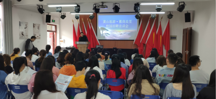 徽商故里文化发展集团是黄山旅游发展股份有限公司旗下的全资子公司,致力于传承徽菜技艺、传播徽州文化。会上,用人单位就公司规章制度,福利待遇,企业文化,组织构架,人力资源政策等几个方面向学生做了简单介绍。招聘会现场气氛热烈,面对学生的不解与困惑,用人单位用专业和认真的态度为学生解答疑惑。