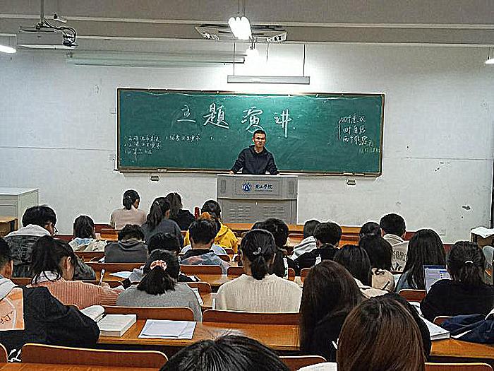 在第二环节的主题演讲中,牛瑞龙同学结合自身经历向同学们诠释如何让抗疫精神在大学生的学习生活中发挥作用。在姜蕾同学的演讲中,同学们仿佛看到一幅幅书写抗疫青春的美丽画面,一幕幕展现青春风采的动人场景。同学们的眼神里洋溢着敬佩之情,为这些青年点赞喝彩。