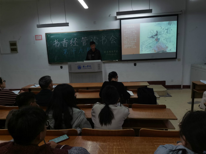 在本次读书分享会中,两位主讲人用通俗易懂的语言,绘声绘色地分享了自己阅读的感悟。20公管专业王璐蕙子同学通过对《史记》之《鸿门宴》名篇讲解,剖析了项羽英勇善战、优柔寡断的性格特征,警醒后人做大事者要审时度势、果断抉择。19国贸专业高乐乐同学分享了《淮南子》名著的博大精深,他围绕该书中“兵略”、“阴阳五行”、“养生术”等主线内容解读,认为道家思想“无为”之真谛是顺势而为。