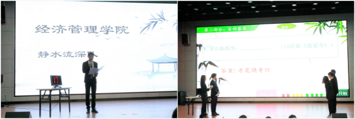 比赛分为心系家国、百科荟萃、手舞足蹈和争分夺秒4个环节,采取主题演讲、提问、表演、抢答等形式进行。第一环节中,各学院代表队分别进行了自我介绍和选自《国学与人生》文章的名篇赏析的展示。第二环节中,各参赛队员在规定时间内完成所选题目的作答。参赛队员准备充分,以沉着的心态和睿智的回答赢得在场观众的一致喝彩。第手舞足蹈环节中,队员们幽默通俗地表演以及智慧、迅疾地回答,展现了他们丰富的知识面和灵敏的反应。争分夺秒环节将比赛推入高潮,参赛队伍两两进行抢答,赛场气氛愈加紧张,但参赛选手依然冷静分析,理智答题。