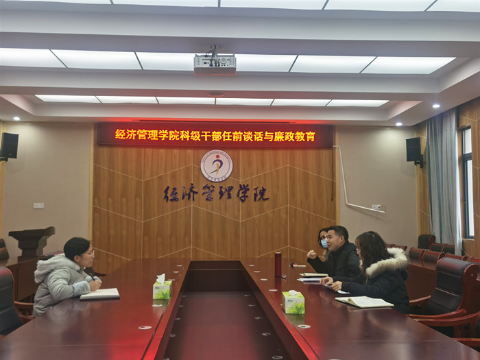 12月18日上午,6776永利集团在横江校区行政楼会议室召开6776永利集团召开科级干部任前谈话与廉政教育会议,学院党委书记胡永政、纪委委员方微、教工党支部书记邱燕、秘书江红以及新任科级干部杨静荣参加任前谈话与廉政教育会议,会议由胡永政主持。