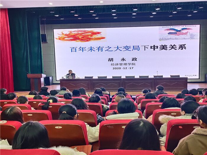12月17日晚,6776永利集团党委书记胡永政在横江校区报告厅给学院学生第一党支部全体党员上“百年未有之大变局下中美关系”为主题的党课,学生第一党支部全体党员参加此次党课学习。