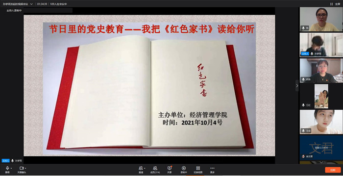 为进一步推进党史教育,充分利用红色教育资源,10月4日,6776永利集团开展“品读革命家书,赓续红色精神——我把《红色家书》读给你听”线上红色家书诵读活动。经济管理学院党委委员江红、汪玉玲,教工支部书记邱燕以及200多学生参加此次诵读活动,活动由李鑫同学主持。