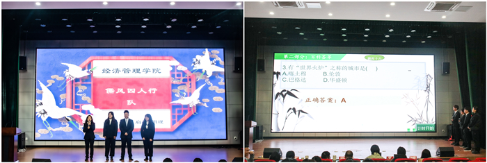此次比赛共分为风采展示、百科荟萃、手舞足蹈和争分夺秒四个环节,采取团队介绍、提问、表演、抢答等形式进行。第一环节中,各学院代表队分别进行了自我介绍。第二环节中,各参赛队员在规定时间内完成所选题目的作答。参赛队员准备充分,以沉着的心态和睿智的回答赢得在场观众的一致喝彩。在手舞足蹈环节中,队员们幽默通俗地表演以及智慧、迅疾地回答,展现了他们丰富的知识面和灵敏的反应。争分夺秒环节将比赛推入高潮,参赛队伍进行抢答,赛场气氛愈加紧张,但参赛选手依然冷静分析,理智答题。