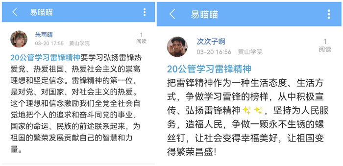 活动开展中,该班团支部充分结合“易班”APP,号召班级学生在易班上发布以“雷锋精神”为核心的相关内容,附带#20公管学习雷锋精神#话题。班级学生发布后将截图发给团支书,由团支书统一审核,并将优秀的帖子留存,这不仅能让学生们进一步学习雷锋精神,还能作为班级团支部发展的见证。