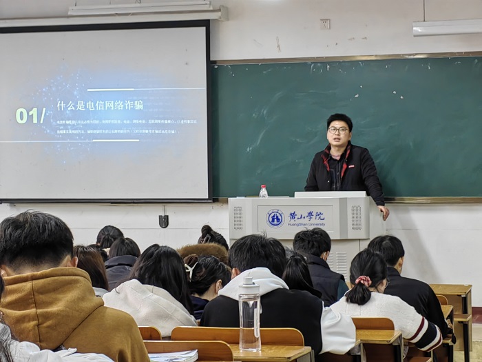 会上,李磊坤从电信诈骗背景屯溪区和学校电诈案件发案情况、电信网络诈骗常见类型、如何通过“国家反诈中心”APP预防诈骗等方面进行深入细致的讲解,提醒大家要避免盲目自信、勿贪小便宜、保护个人隐私、养成正确的生活消费观念。