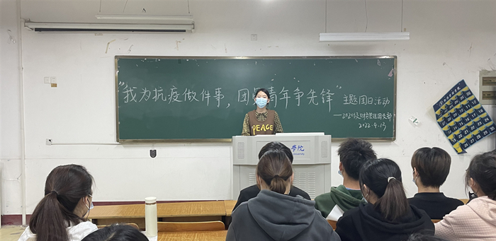 4月13日,2020级财务管理团支部在横江校区1101教室开展“我为抗疫做件事 团员青年争先锋”主题团日活动。本次活动由团支书周依然主持,团委副书记李斌到会指导。