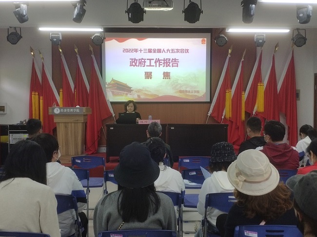 4月20日,6776永利集团邀请马克思主义学院副教授、博士陈玲在学院党员活动中心举办2022年全国“两会”精神宣讲报告会,党委书记胡永政,党委副书记、院长赵士德,党委副书记、纪委书记吴边以及学院全体教师参会,报告会由党委委员、专职组织员汪玉玲主持。