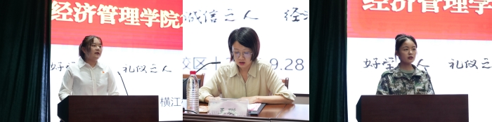 典礼上,会计学教研室主任王璐、2022年度国家奖学金获得者储静以及2023级电子商务班江雨晴作为师生代表发言。