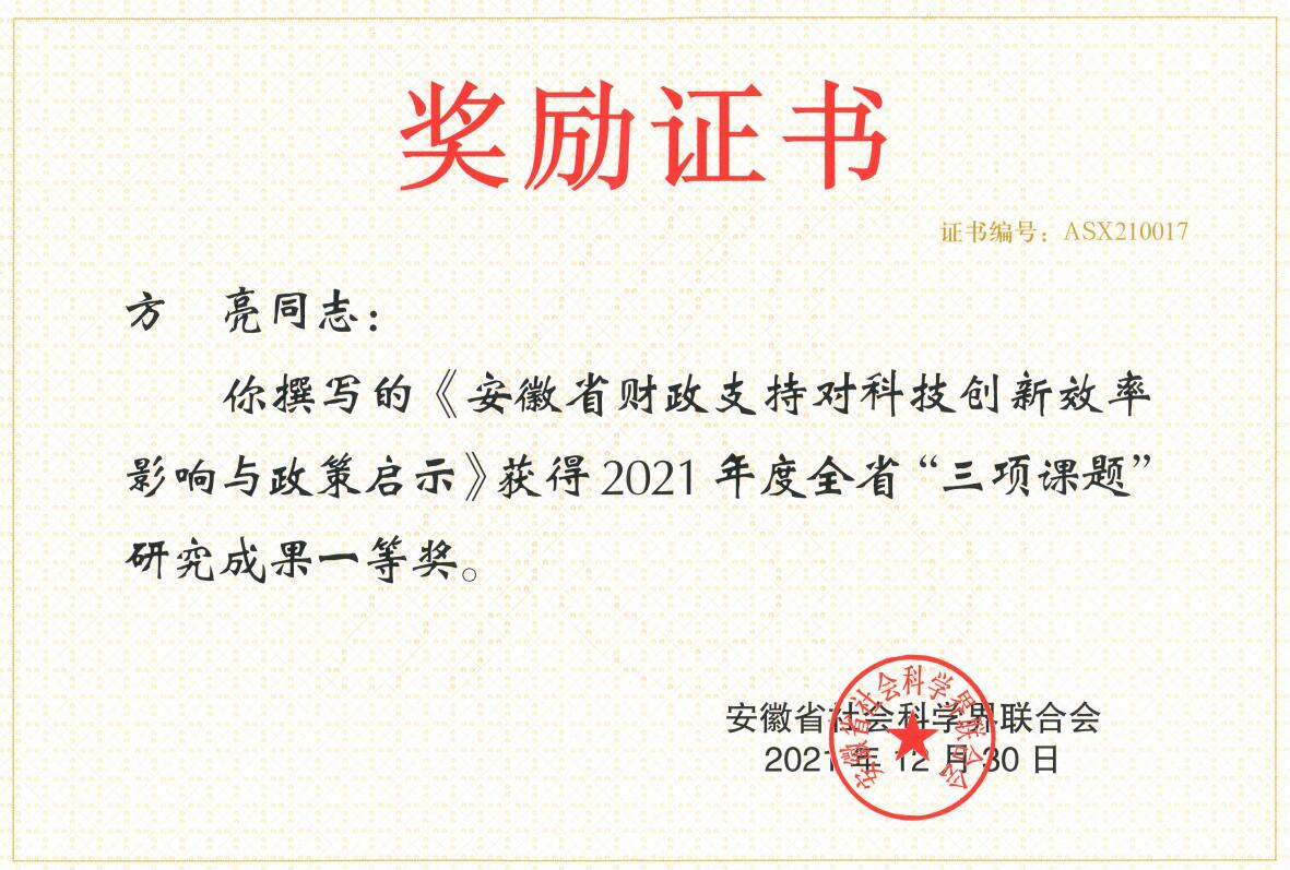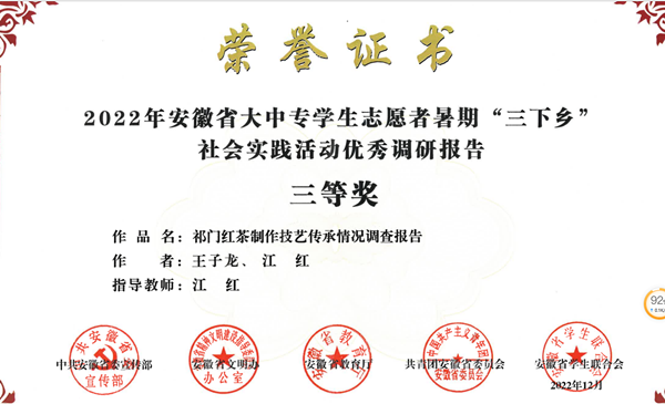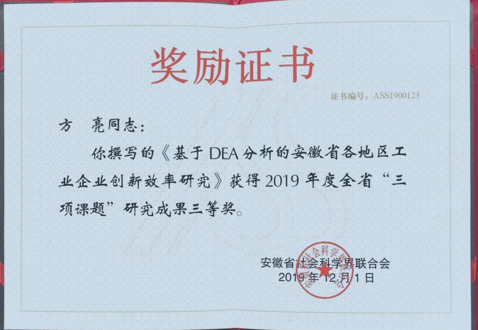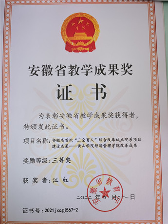 学院多名教师获得省市科研成果奖,其中方亮获省“三项课题”研究成果一等奖、三等奖,计东亚获黄山市社会科学发展研究课题二等奖;发挥学科专业优势,聚焦地方经济社会发展战略需求献计献策,安梅霞、计东亚、孙艳等教师撰写3个咨询报告被市委市政府采纳;