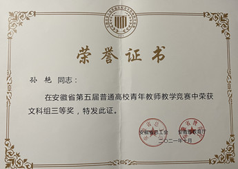 以吴文浩、胡永政和汪艳教授领衔打造3个教学团队获批省级教学(创新)团队、2名教师获得安徽省教学名师荣誉、6名青年教师获得省级教坛新秀称号。