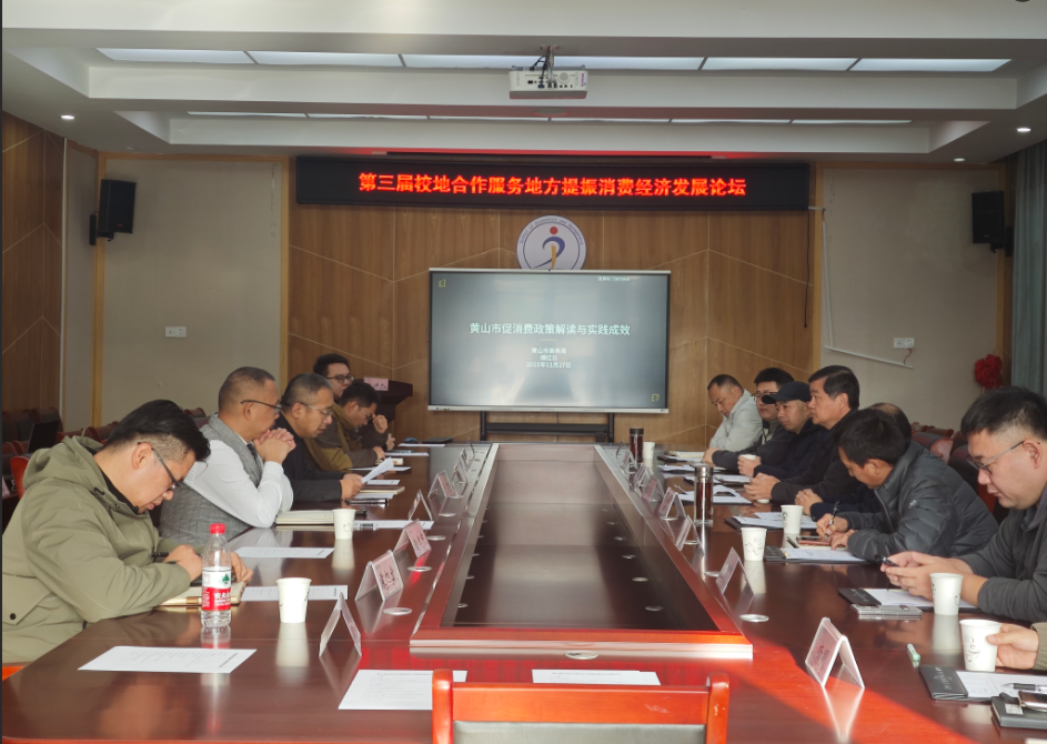 2025 年 11 月 27 日上午,第三届校地合作服务地方提振消费经济发展论坛在6776永利集团3楼会议室召开。本次论坛以“提振消费”为核心主题,汇聚政府部门、企业代表、高校教师等多方力量,通过政策解读、成果分享、交流研讨,为黄山市消费经济高质量发展搭建校地协同平台。