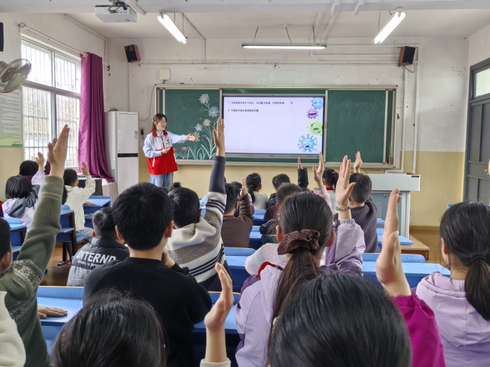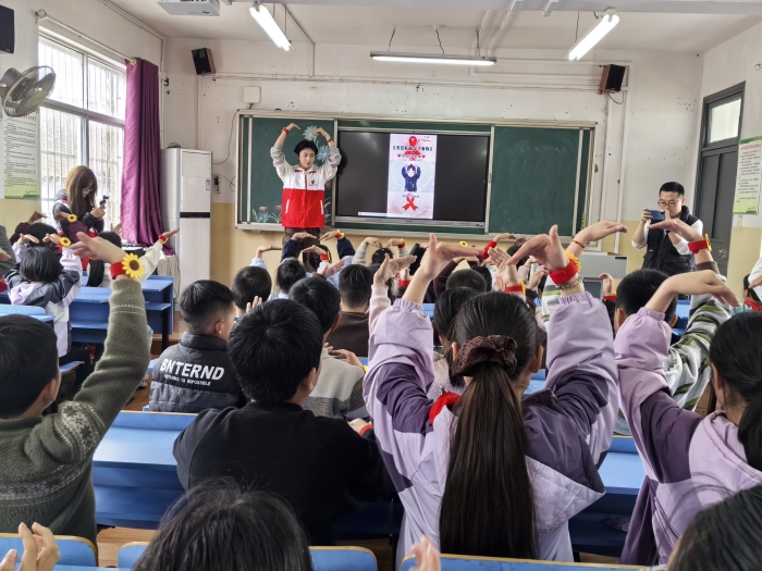 互动答疑环节暖意融融,孩子们热情高涨、积极踊跃,高高举起的小手此起彼伏,大胆提出心中疑问,主动分享学习感悟。面对童真提问,宣讲团成员耐心细致地逐一解答,并通过趣味问答、知识抢答巩固所学;课堂现场还特别增设了防艾手势舞趣味互动,在欢快的节奏里,大家戴着红色手环一起学习防艾手势舞,用简单易学的动作传递健康知识,现场笑声、掌声不断。纯真笑脸与热烈氛围交融,整个教室满是朝气与温暖。