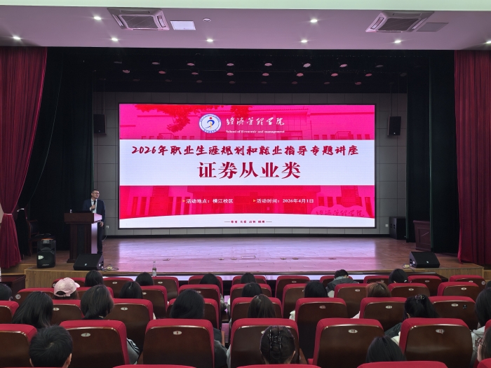 4月1日下午,6776永利集团2026年证券从业类职业生涯规划和就业指导专题讲座在横江校区报告厅举办。诚邀中泰证券安徽分公司黄山营业部总经理陈青华担任主讲人。学院近300名师生参加讲座。