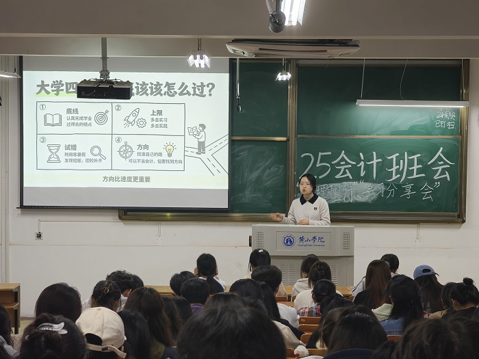 王宁致博士以“走出拥挤的电影院,寻找自己的旷野”为题,紧密围绕会计专业学生的成长路径与职业发展作专题分享。她指出,学历只是起点而非终点,真正的职场竞争力来源于持续积累的专业能力和扎实的实操功底。初级会计职称、CPA、税务师等职业资格证书,以及Excel等实务操作技能,是会计专业学生的“职场硬通货”。