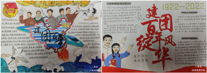 此次参赛作品主题突出、设计巧妙、图文并茂,内容紧扣时政、构思新颖别致,充分体现了把自己对“建团100周年”感悟体会融入到一个个字,一幅幅画之中创作理念,每幅作品始终保持艰苦奋斗的前进姿态跃然纸上,抒发了新时代青年为实现伟大复兴的中国梦而不懈奋斗努力的昂扬之情。通过在易班网上的公开投票以及评委老师评分,2021级会计班程卓妍获得一等奖;2020级电子商务班周梦瑶、2021级电子商务班李琪获得二等奖;2020级会计班邓冰妍、2021级电子商务黄梦缘、2021级电子商务吴春荣、2021级市场营销班徐梦获得三等奖。