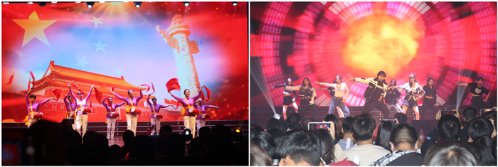 晚会在“声入人心乐队”表演中拉开序幕;离退休老师腰鼓队表演《没有共产党就没有新中国》和赵又娇、胡小莉老师亲情献唱《我们的新时代》为晚会增添了一道靓丽风景;声乐天团的《歌曲串烧》、《想把我唱给你听》和《老男孩》都让我们感受到不一样的曲风、青春活力的爵士舞《Helidoperinga》和《Uh-oh pop》让现场的气氛高潮跌宕;民舞《小城烟雨时》舞姿优美、《Noble》以及街舞《Battle Pets》和《报童之歌》曼妙舞姿,大饱观众眼福,晚会在压轴节目大合唱《在灿烂的阳光下+灯火里的中国》结束,晚会达到高潮,整场晚会精彩不断,掌声不断。
