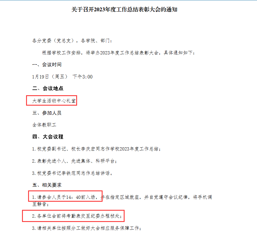 学校2023年度总结表彰大会即将召开,请各位老师根据学校会议通知要求,准时参加会议。