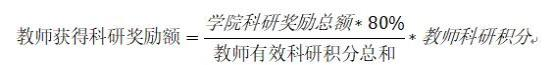 4 、根据学院当年度用于科研奖励的金额与申报重点学 术成果教师获得的有效科研积分总和计算分均奖励额 ,按照每位教师有效科研积分计算奖励额度。计算公式如下: