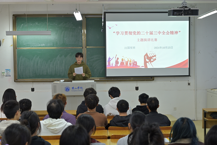 10月26日,开展了“学习贯彻党的二十届三中全会精神,共筑新时代发展蓝图”主题演讲比赛。曹远、胡娱传杰、仇佳豪和陈婉婷四位同学分别以饱满的热情和深刻的见解,围绕学习贯彻党的二十届三中全会精神进行了精彩的演讲,他们的演讲内容丰富、观点鲜明,不仅展现了新时代青年的责任与担当,而且让在场的每一位同学对党的二十届三中全会精神有了更加全面和深刻的理解,更极大地激发了同学们的爱国之情和报国之志。