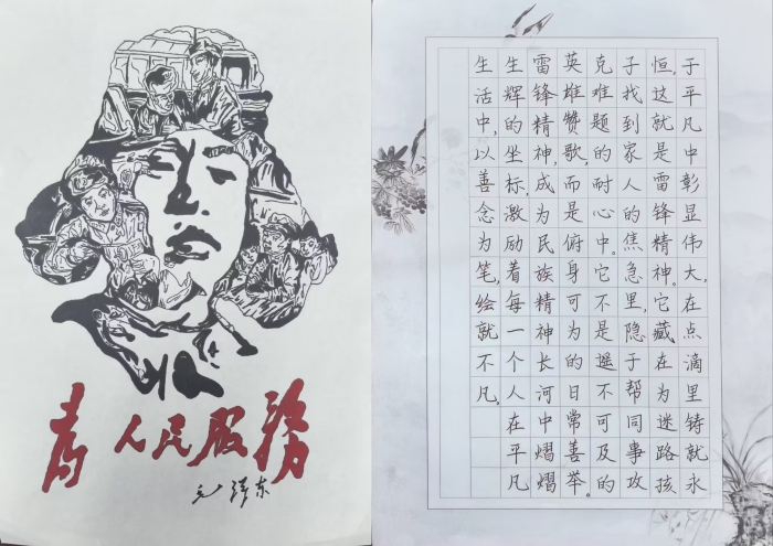 弘扬雷锋精神,打造校园帮扶“加油站”。在雷锋月期间,经济管理学院创新性推出“雷锋精神我践行”主题活动,同学们在“学习雷锋精神”实践点,通过书签寄语、卡牌游戏、趣味问答等形式,抒发对雷锋同志的敬仰,活动参与人数近千余人,反响热烈。“雷锋月摄影大赛”主题活动,用镜头记录身边的雷锋精神,让雷锋精神深入人心,更好地传承和发扬。“一站式”学生社区功能型党支部通过书画创作弘扬雷锋精神,近200幅作品以笔墨传情,生动展现了“为人民服务”的深刻内涵。此外,23国贸班充分发挥专业特长,为留学生开设《外贸单证实训》帮扶课堂,从理论讲解到实操演练,中外学子互学互鉴,以实际行动践行“钉子精神”。
